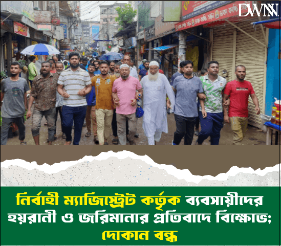 নির্বাহী ম্যাজিস্ট্রেট কর্তৃক ব্যবসায়ীদের হয়রানী ও জরিমানার প্রতিবাদে বিক্ষোভ; দোকান বন্ধ