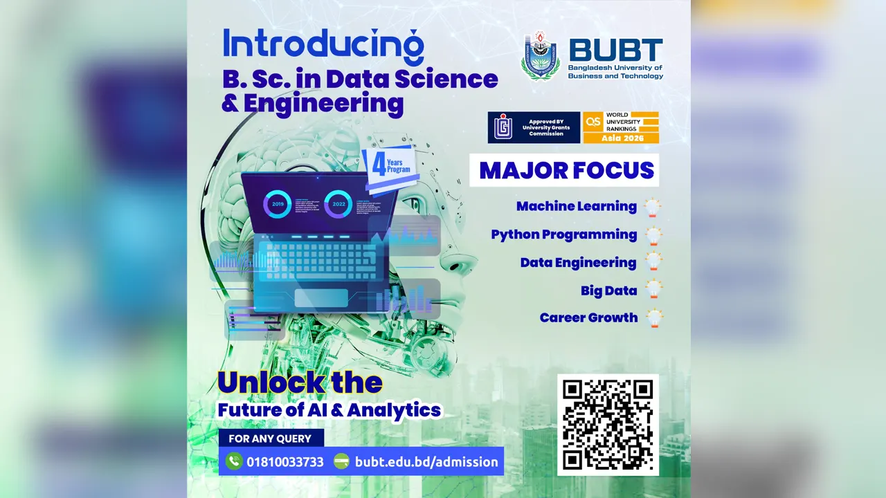 দেশের প্রযুক্তি খাতের উচ্চশিক্ষায় এক নতুন মাইলফলক স্পর্শ করল বাংলাদেশ ইউনিভার্সিটি অব বিজনেস অ্যান্ড টেকনোলজি (বিইউবিটি)। বাংলাদেশ বিশ্ববিদ্যালয় মঞ্জুরি কমিশন (ইউজিসি) সম্প্রতি এই বিশ্ববিদ্যালয়ে অত্যন্ত চাহিদাসম্পন্ন দুটি নতুন প্রোগ্রাম—’বিএসসি ইন ডাটা সায়েন্স অ্যান্ড ইঞ্জিনিয়ারিং’ এবং ‘এমএসসি ইন কম্পিউটার সায়েন্স অ্যান্ড ইঞ্জিনিয়ারিং (সিএসই)’ চালুর চূড়ান্ত অনুমোদন প্রদান করেছে। চতুর্থ শিল্প বিপ্লবের চ্যালেঞ্জ মোকাবিলায় এবং বিগ ডাটা, কৃত্রিম বুদ্ধিমত্তা (AI) ও মেশিন লার্নিংয়ের মতো আধুনিক প্রযুক্তিতে শিক্ষার্থীদের দক্ষ করে তোলাই এই নতুন কারিকুলামের প্রধান লক্ষ্য। চলতি বছরের জানুয়ারি ২০২৬ সেশন থেকেই এই প্রোগ্রামগুলোতে শিক্ষা কার্যক্রম শুরু হতে যাচ্ছে।