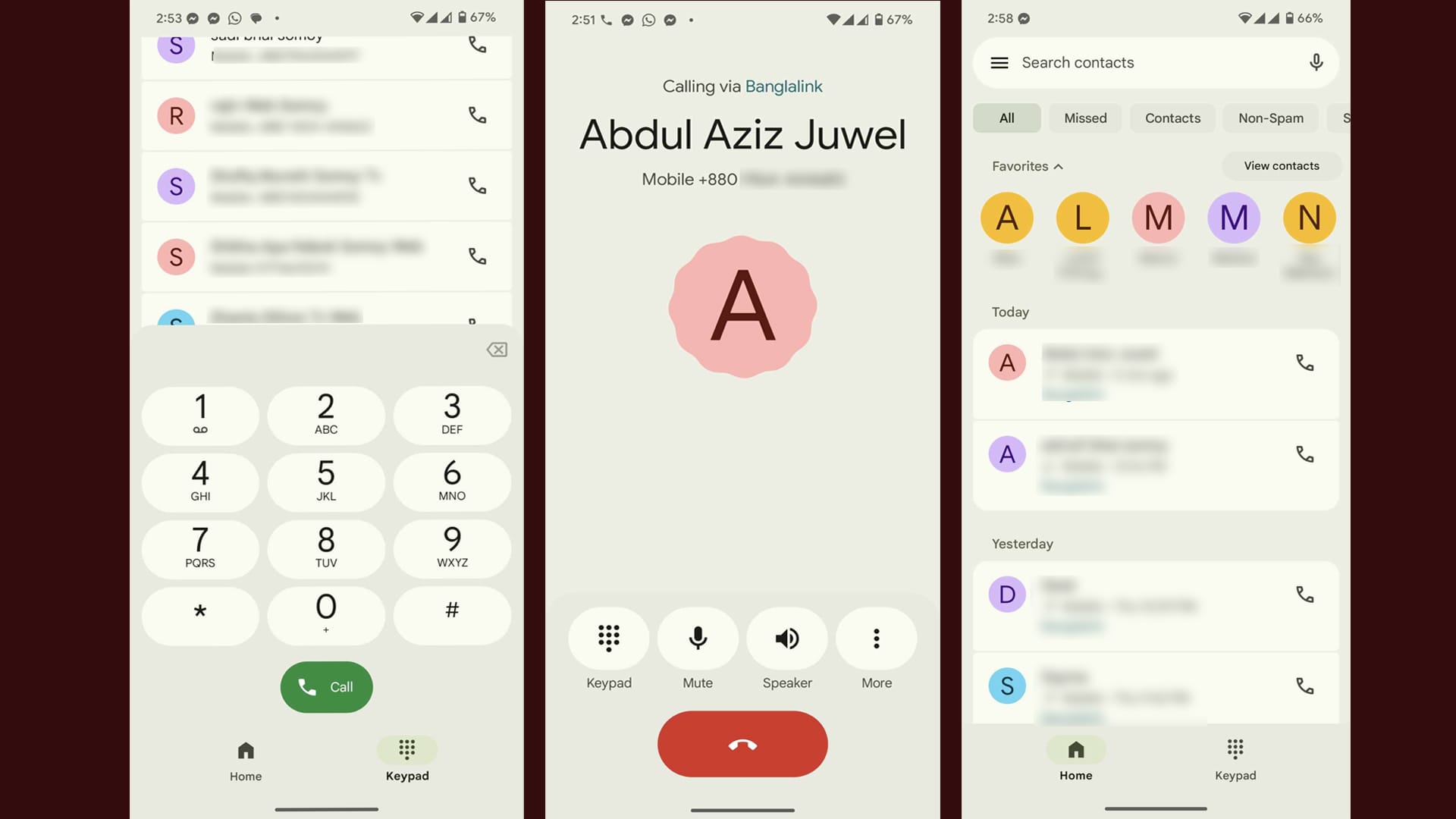 নতুন সংস্করণে বেশ কিছু বড় পরিবর্তন আনা হয়েছে। এখন হোম পেজে ফেভারিট ও রিসেন্ট কল একত্রিত করে একটি ‘হোম’ ট্যাবে রাখা হয়েছে। প্রিয় কন্টাক্টগুলো স্লাইডারের মতো উপরে থাকবে এবং নিচে কল লিস্ট কার্ড আকারে দেখা যাবে। ডায়ালপ্যাডে আর আলাদা ফ্লোটিং বাটন নেই, বরং মাঝখানেই সরাসরি গোলাকার ও আধুনিক কীপ্যাড দেখা যাবে। কন্টাক্ট খোঁজার জন্য আগে আলাদা ট্যাব থাকলেও এখন তা সার্চ ফিল্ড থেকে ড্রয়ার মেনুর মাধ্যমে সহজে পাওয়া যাবে।