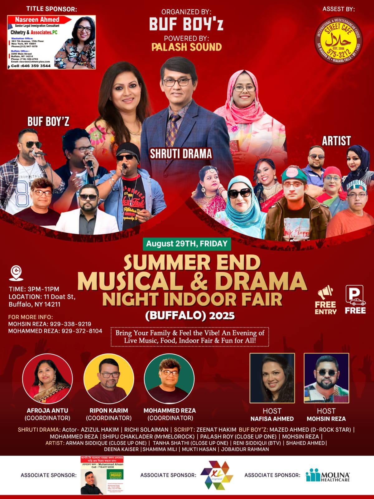 আগামী ২৯ আগস্ট, শুক্রবার যুক্তরাষ্ট্রের নিউইয়র্ক অঙ্গরাজ্যের বাফেলোতে আয়োজিত হতে যাচ্ছে দিনব্যাপী “সামার এন্ড মিউজিক্যাল অ্যান্ড ড্রামা নাইট ইনডোর ফেয়ার ২০২৫”। দুপুর ৩টা থেকে রাত ১১টা পর্যন্ত চলবে এ আয়োজন, যার ভেন্যু নির্ধারণ করা হয়েছে 11 Doat St, Buffalo, NY 14211। দর্শক ও অংশগ্রহণকারীদের জন্য প্রবেশ এবং পার্কিং সম্পূর্ণ ফ্রি রাখা হয়েছে।