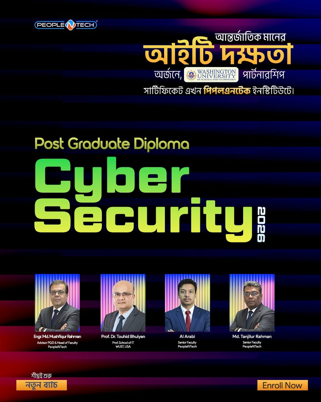 বর্তমান ডিজিটাল বিশ্বে তথ্যের সুরক্ষা নিশ্চিত করাই এখন সবচেয়ে বড় পেশাদার চ্যালেঞ্জ। সময়ের এই চাহিদাকে গুরুত্ব দিয়ে আন্তর্জাতিক মানের তথ্যপ্রযুক্তি প্রশিক্ষণ প্রতিষ্ঠান পিপলএনটেক ইনস্টিটিউট অব আইটি (PeopleNTech Institute of IT) এবং আমেরিকার ওয়াশিংটন ইউনিভার্সিটি অব সায়েন্স অ্যান্ড টেকনোলজি (Washington University of Science and Technology – WUST) যৌথভাবে শুরু করেছে ‘পোস্ট গ্রাজুয়েট ডিপ্লোমা (PGD) ইন সাইবার সিকিউরিটি’। আপনি যদি ইথিক্যাল হ্যাকিং থেকে শুরু করে ডিজিটাল ফরেনসিকের খুঁটিনাটি শিখে নিজেকে বিশ্বমানের সাইবার সিকিউরিটি স্পেশালিস্ট হিসেবে গড়তে চান, তবে এই কোর্সটি আপনার ক্যারিয়ারে নতুন দিগন্ত উন্মোচন করতে পারে।