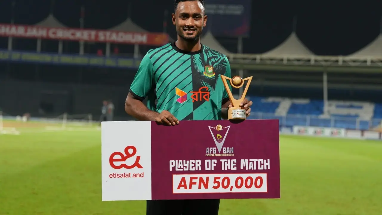 আফগানিস্তানের বিপক্ষে সিরিজ নিশ্চিত করা ম্যাচে দারুণ পারফরম্যান্সের মাধ্যমে আলোচনায় এসেছেন বাংলাদেশ দলের তরুণ পেসার শরিফুল ইসলাম। বল হাতে নিয়ন্ত্রিত বোলিংয়ে ৪ ওভারে মাত্র ১৩ রান খরচায় গুরুত্বপূর্ণ উইকেট তুলে নেওয়ার পাশাপাশি, ব্যাট হাতে দলকে জয়ের বন্দরে পৌঁছে দেন তিনি। ম্যাচের শেষ মুহূর্তে ধারাবাহিক দুই বাউন্ডারি ও একটি সিঙ্গেলের মাধ্যমে বাংলাদেশকে ২ উইকেটে জয় এনে দেন এই পেসার। ফলে তিনি নির্বাচিত হন ম্যাচসেরা (Man of the Match)।