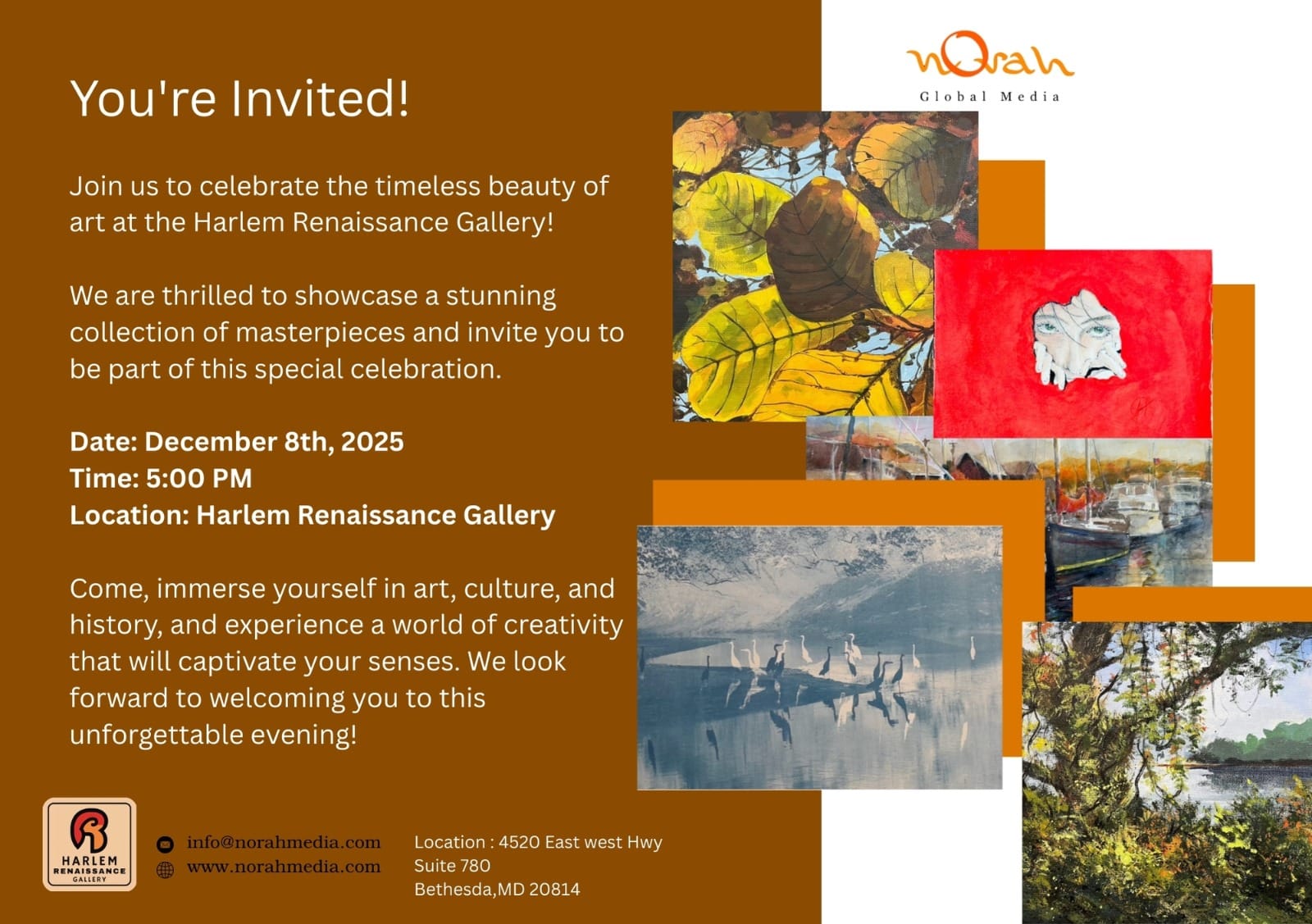 বেথেসডা, মেরিল্যান্ড — রঙ, সৃজনশীলতা ও সংস্কৃতির অপূর্ব যাত্রায় দর্শকদের আমন্ত্রণ জানাতে প্রস্তুত হয়েছে Harlem Renaissance Gallery। আগামী ৮ ডিসেম্বর ২০২৫ সন্ধ্যায় অনুষ্ঠিত হতে যাচ্ছে বহু প্রতীক্ষিত Harlem Renaissance Gallery Showing, যেখানে দর্শনার্থীরা দেখতে পাবেন কালজয়ী শিল্পকর্ম, ইতিহাসের গল্প এবং প্রতিটি ক্যানভাসে লুকিয়ে থাকা সংস্কৃতির অনন্য ছোঁয়া। শিল্প, সৌন্দর্য, মানবিক অনুভূতি ও ঐতিহ্যের এই সম্মিলন প্রদর্শনীটি হতে যাচ্ছে শিল্পপ্রেমীদের জন্য এক স্মরণীয় সন্ধ্যা।